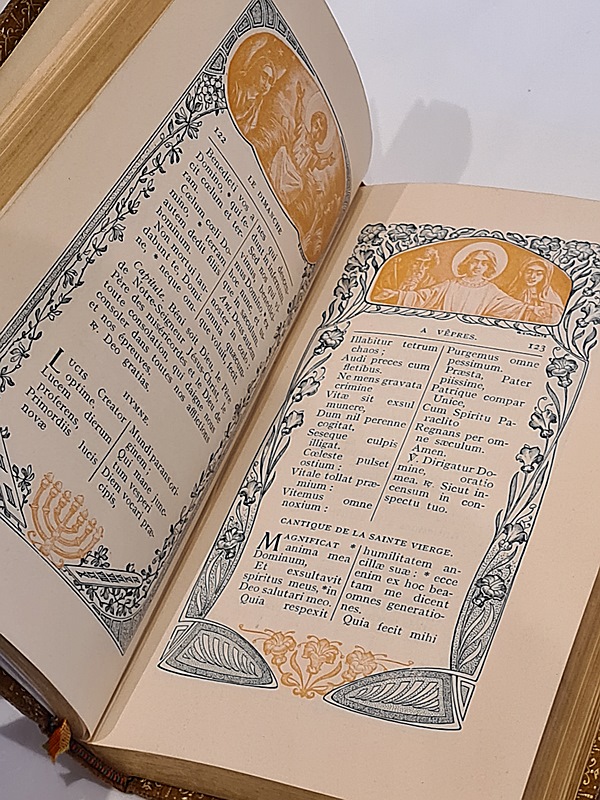 Turnhout, Brepols, 1912 ; in-12 relié pleine basane havane (bords légèrement émoussés, petite épidermure sur le plat supérieur), dos plats, cadres dorés au plat supérieur et motifs en dorure à froid sur les deux plats, tranches dorées, gardes encadrées d'ornements dorés, frontispice et titre-frontispice, large cadre à chaque page, 380 pp.